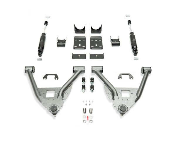 IHC’s 2014-2018 3/5 Single Cab lowering kits consists of 3” front lower control arms, strut spacer for easy height adjustment, and sway bar links. This allows for a simple replacement of lower control arms. No need to disassemble strut assembly. The rear end consists of a flip kit and 1” lift shackles to achieve a 5” rear drop. This is a huge advantage and saves the installer a huge amount of installation time. By adding the 1” lift shackles you get away from removing the rear OEM hanger which is bolted up with rivets.  Nitrogen drop shocks are included.  All IHC suspension parts are fiber laser cut, CNC bend, and robotically welded for precise quality.